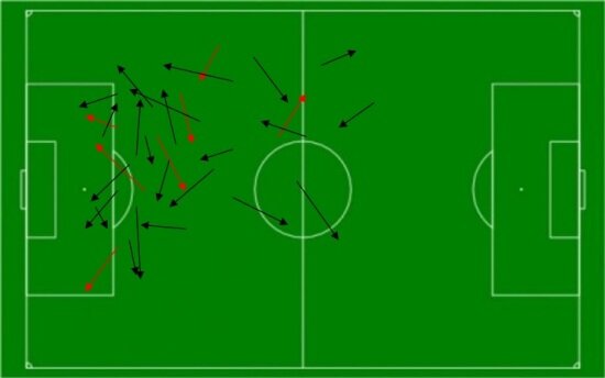 Procent celności podań krótkich u Ondraska jest na bardzo zbliżonym poziomie, jak w pierwszym analizowanym przez nas meczu. Tym razem niczym szczególnym się nie wykazał, ale można zwrócić uwagę na to, że unikał podań bardziej wyrafinowanych, a grał bezpiecznie.