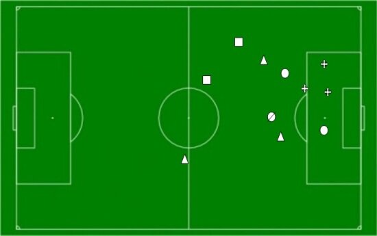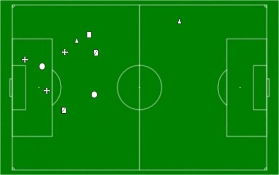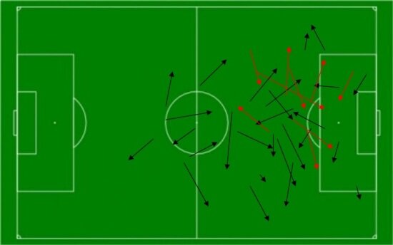 Kolorem czarnym oznaczyliśmy podania/strzały celne, czerwonym niecelne, a niebieskim gole. Otwartym kołem oznaczyliśmy natomiast pojedynki główkowe wygrane, przekreślonym kołem przegrane, trójkątem odbiory, krzyżykiem straty, otwartym kwadratem faule na zawodniku, a przekreślonym kwadratem faule zawodnika.