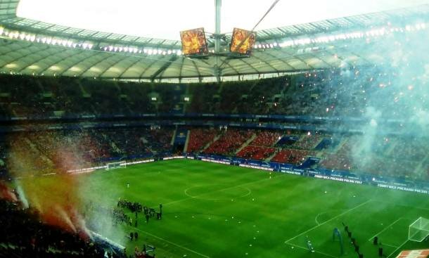 Przed większymi meczami najbardziej lubię obserwować nawarstwiającą się atmosferę zbliżającego się widowiska. Stadion dwie godziny przed spotkaniem zalany był masą żółto-niebieskich i niebiesko-białych barw. Kibice byli po prostu wszędzie! Robiło to wrażenie. O ile na mieście, jak wspominałem, od czasu do czasu można było zobaczyć pojedyncze barwy, o tyle przed Stadionem Narodowym gotowało się jak w kotle. Marsze, okrzyki na zewnątrz, jak i już wewnątrz stadionu. Do tego wszystko w przyjaznej atmosferze, przez którą - parafrazując naszą dawną Minister Sportu - nikt nawet nie ośmieliłby się zapytać, kto wybierał drużyny do tego meczu.