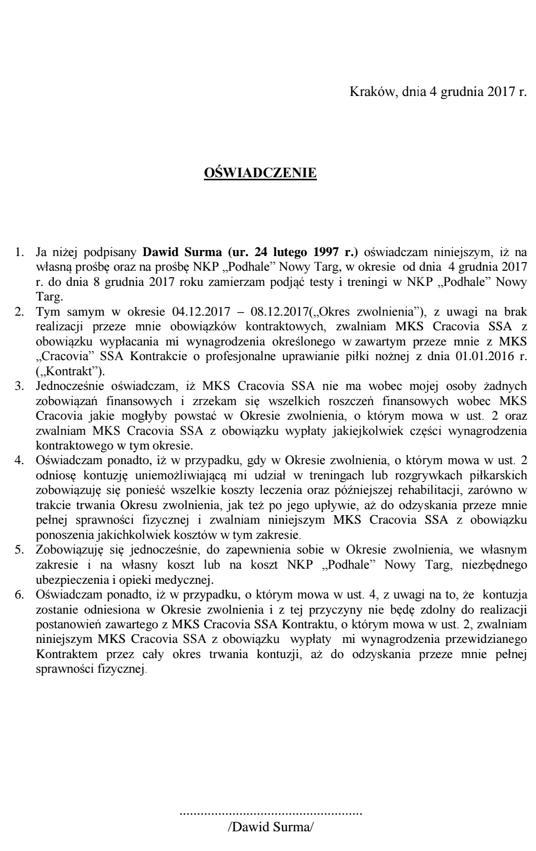 Oświadczenie, które Surma musiał podpisać przed wyjazdem na testy do Podhala Nowy Targ. Trafiło kolejno do Tomasza Bałdysa (Cracovia), Ireneusza Hurwicza (menadżer piłkarski) oraz kancelarii prawnej Chałas i Wspólnicy.