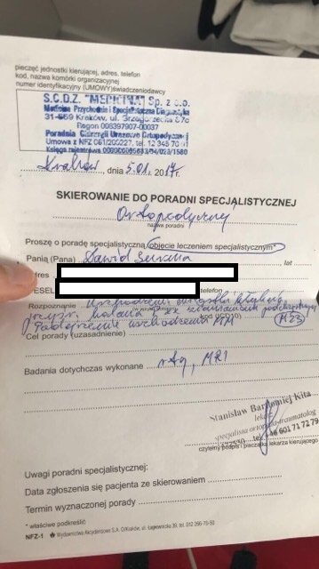 Dawid Surma: Stanisław Bartłomiej Kita, ortopeda z ponad 35-letnim stażem, były lekarz klubowy Cracovii, prowadzi zajęcia na Akademii Wychowania Fizycznego. Tam studiuje moja dziewczyna, Julia. To ona poprosiła go, żeby mnie zbadał. Ortopeda wystawił skierowanie na rezonans, który został przeprowadzony 12 grudnia 2016 w Rzeszowie.