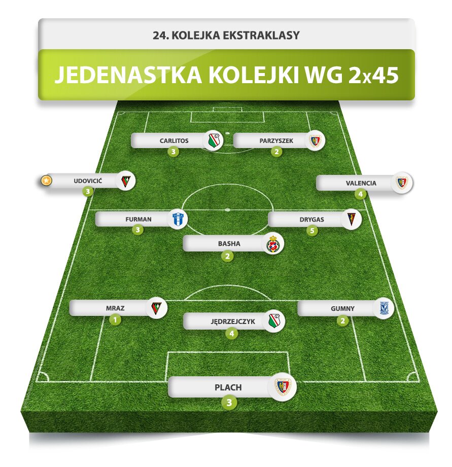 Jedenastka i antyjedenastka 24. kolejki Ekstraklasy według 2x45 plus kilka bonusów. Piast znowu rządzi