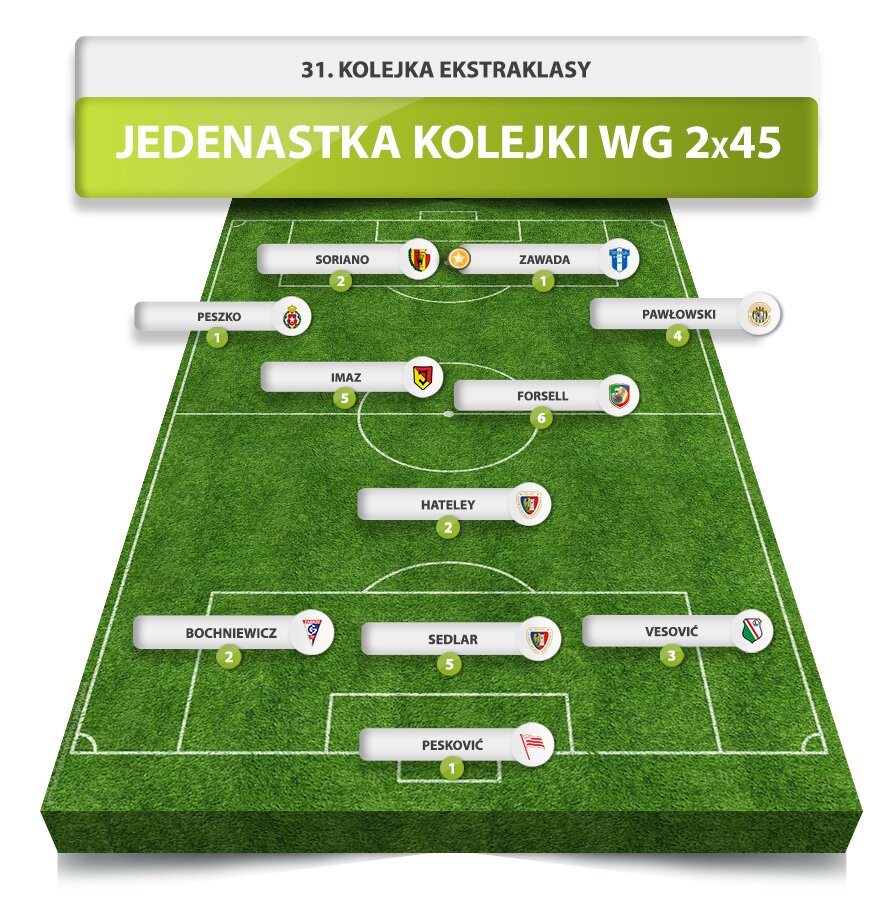 Jedenastka i antyjedenastka 31. kolejki Ekstraklasy według 2x45 plus kilka bonusów