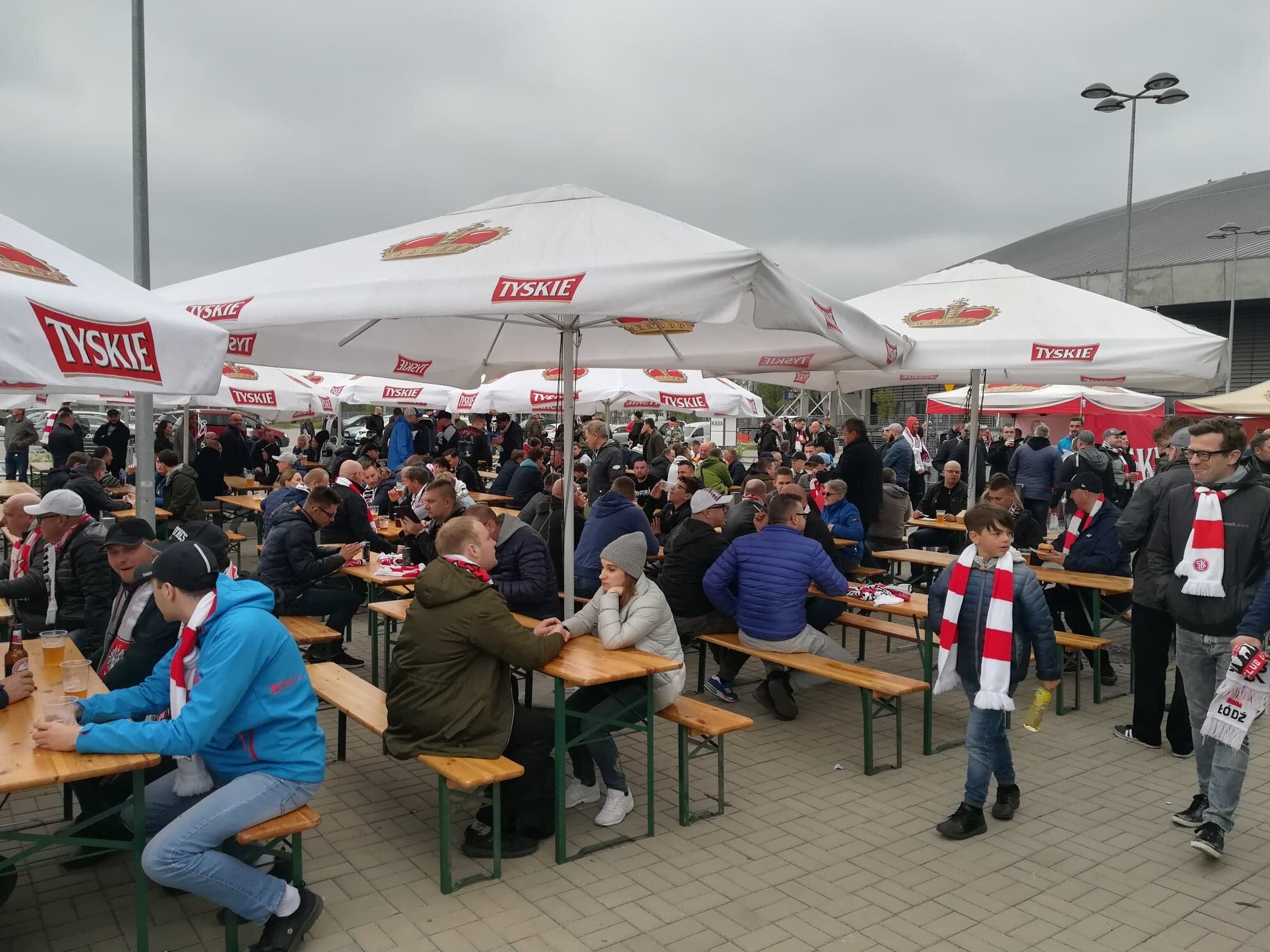 Z trzeciej strony nie ma się co dziwić, że w zaistniałej sytuacji szybciej niż stadion rośnie... strefa kibica tuż pod nim. Gdy wystartowała kilka spotkań temu, składała się z kilku wagonów z żarełkiem i piwem, paru ławek pod parasolami i tyle. Wczoraj postanowiliśmy się tam wybrać, by sprawdzić, jak bardzo została powiększona, ponieważ zapowiadano to parę dni przed meczem. No i naprawdę można być pod wrażeniem: