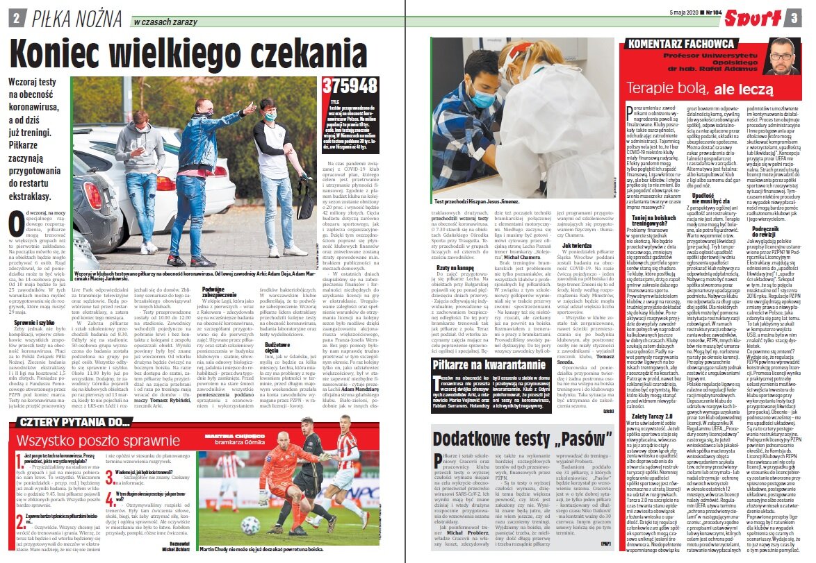 „Zgodnie z przyjętym planem wznowienia rozgrywek PKO Ekstraklasy 4 maja odbyły się badania w klubach ekstraklasy na obecność koronawirusa. Poddane im zostały wszystkie osoby, które od 20 kwietnia przebywały w zespołach na tzw. izolacji sportowej. W każdej drużynie była to grupa do 50 ludzi – zawodnicy, trenerzy, sztab medyczny i pracownicy klubu mający bezpośredni kontakt z piłkarzami”.