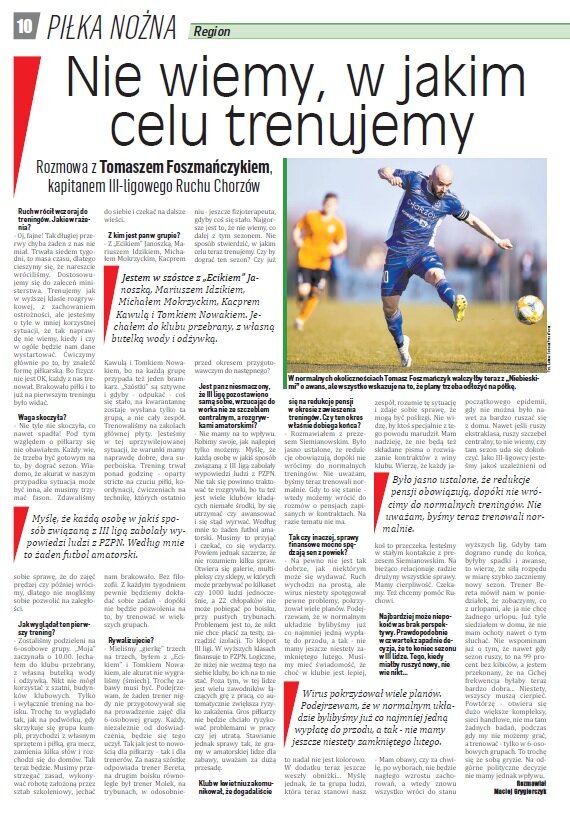 - Oj, fajne! Tak długiej przerwy chyba żaden z nas nie miał. Trwała siedem tygodni, to masa czasu, dlatego cieszymy się, że nareszcie wróciliśmy. Dostosowujemy się do zaleceń ministerstwa. Trenujemy jak w wyższej klasie rozgrywkowej, z zachowaniem ostrożności, ale jesteśmy o tyle w mniej korzystnej sytuacji, że tak naprawdę nie wiemy, kiedy i czy w ogóle będzie nam dane wystartować. Ćwiczymy głównie po to, by znaleźć formę piłkarską. Bo fizycznie jest OK, każdy z nas trenował. Brakowało piłki i to już na pierwszym treningu było widać.