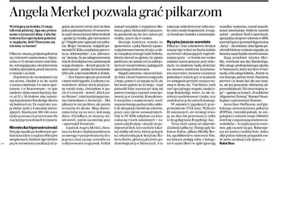 „Białoruś, Wyspy Owcze i Niemcy – rozgrywki w tych trzech europejskich ligach mogą się toczyć za nieco ponad tydzień. Kluby Bundesligi dopięły celu, władze Niemiec wydały zgodę na powrót piłkarzy do gry. Takie decyzje zapadły podczas konferencji z udziałem kanclerz Angeli Merkel i premierów landów. Konferencja pani kanclerz przeciągała się, ale w końcu o 15.45 wystąpiła przed grupką dziennikarzy. Futbol nie był oczywiście głównym punktem jej przemówienia, ale po ośmiu minutach potwierdziła, że piłkarze 1. i 2. Bundesligi mogą wrócić do gry w drugiej połowie maja. Tym samym Bundesligi będą pierwszymi ligami w Europie, które wznowią przerwane rozgrywki z powodu pandemii koronawirusa, bo Farerowie i nasi wschodni sąsiedzi zaczną lub zaczęli już nowy sezon”.
