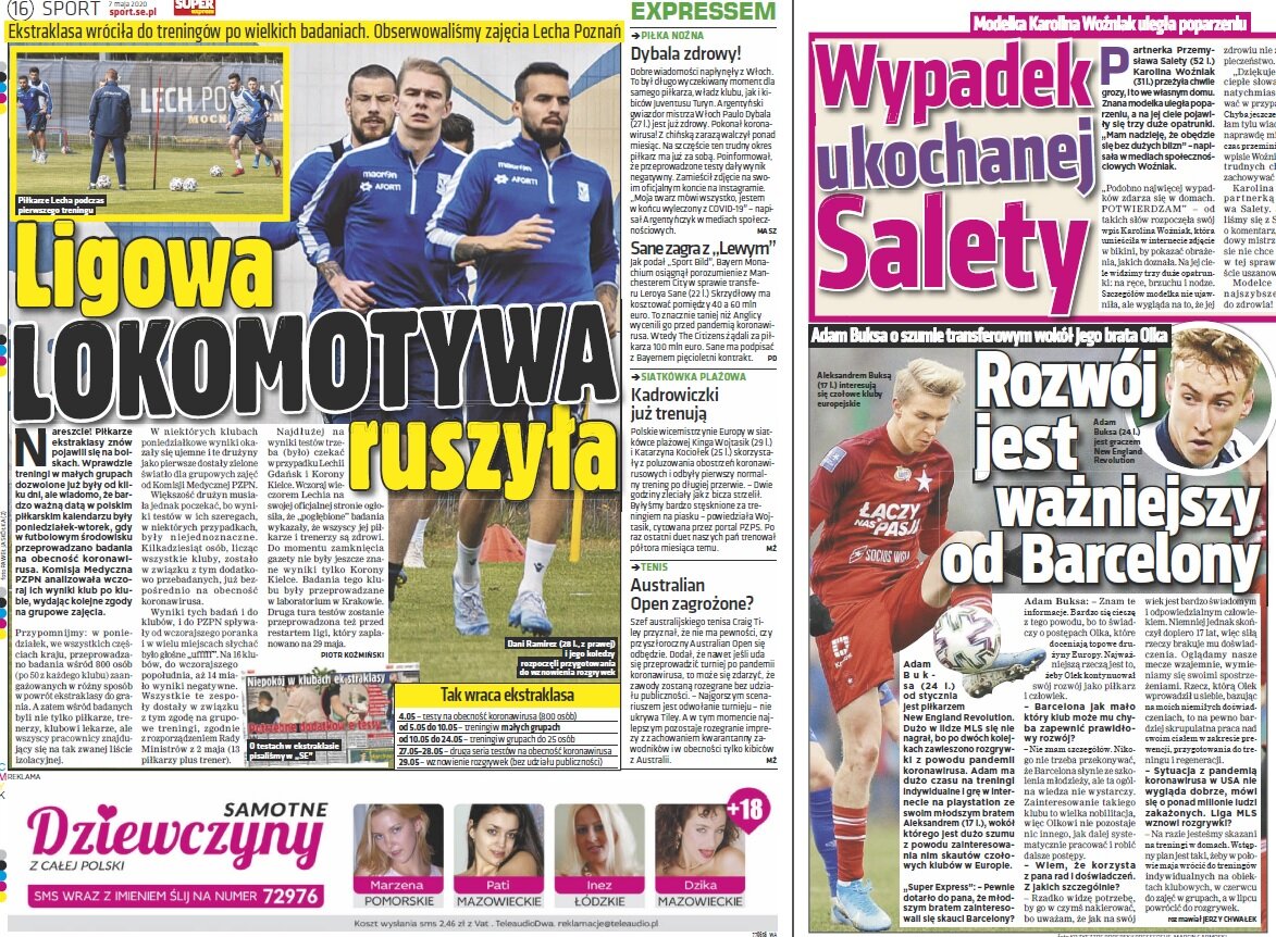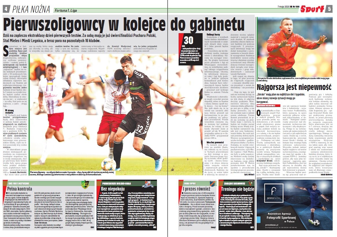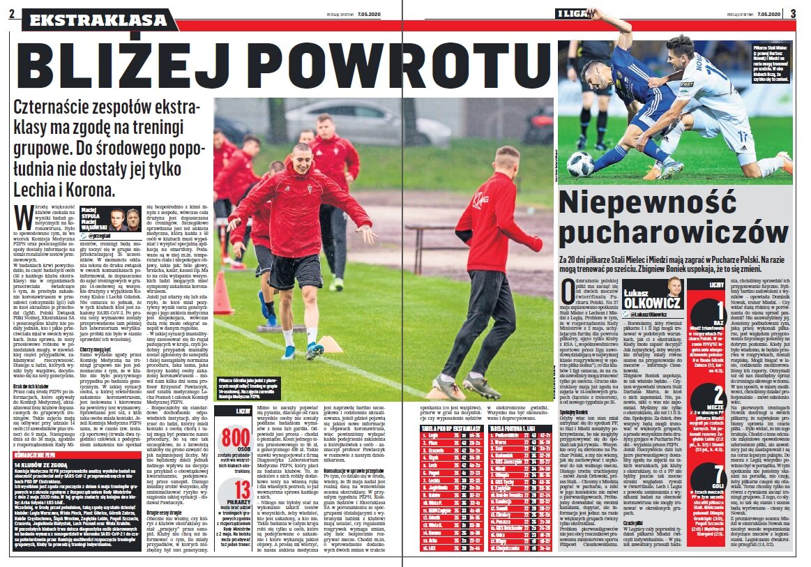 „Odmrażanie polskiej piłki ma zacząć się od dwóch meczów ćwierćfinału Pucharu Polski. Na 27 maja zaplanowano spotkania Stali Mielec z Lechem i Miedzi z Legią. Problem w tym, że w rozporządzeniu Rady Ministrów z 2 maja, uchylającym furtkę dla powrotu piłkarzy, ujęto tylko kluby z ESA („współzawodnictwo sportowe przez ligę zawodową działającą w najwyższej klasie rozgrywkowej w sporcie piłka nożna”), co dla klubów I ligi oznacza, że na razie zawodnicy mogą trenować tylko po sześciu. Gracze ekstraklasy mają już zgodę na zajęcia w 14-osobowych grupach (łącznie z trenerem), a od nowego tygodnia po 25”.