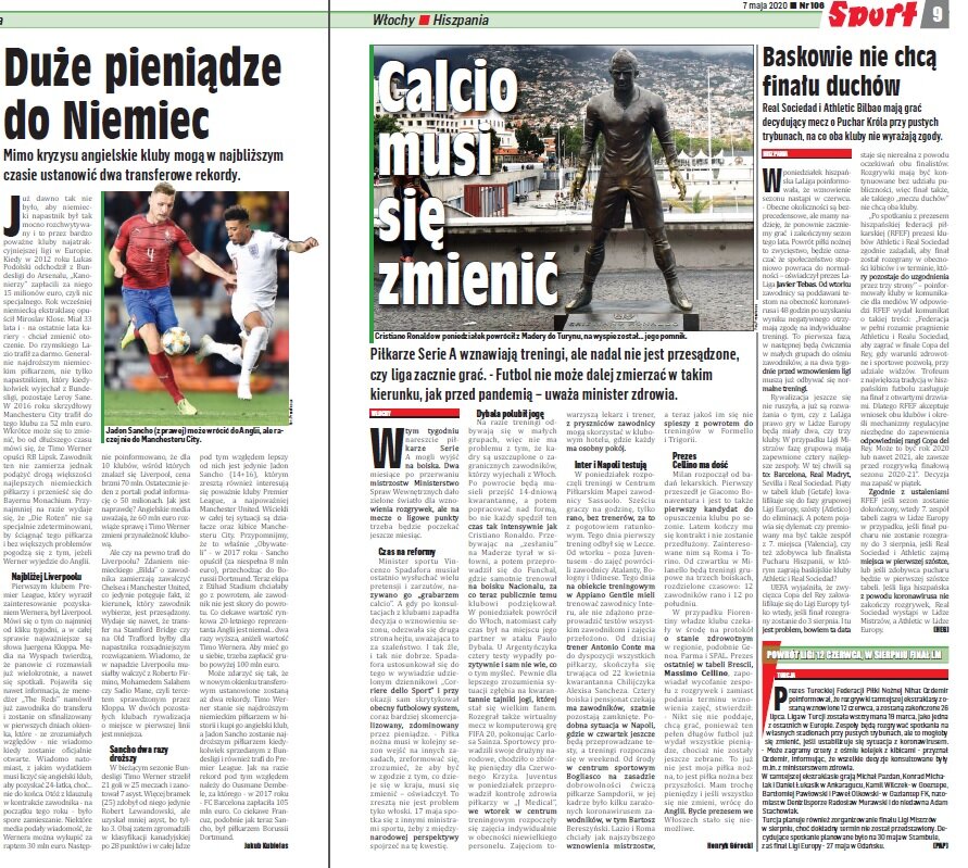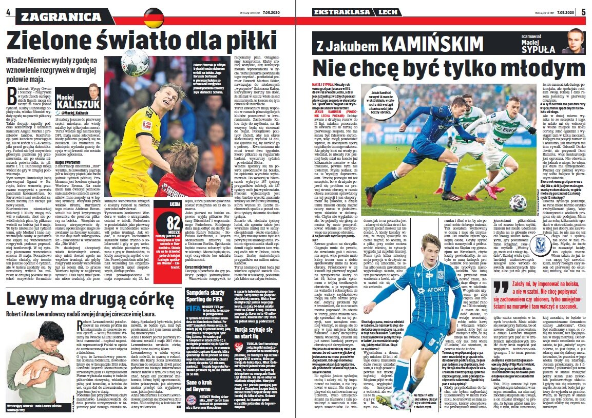 Przejrzeliśmy czwartkową prasę i musimy przyznać, że jest sporo ciekawych artykułów. Głównym tematem jest oczywiście koronawirus i start rozgrywek w Europie, więc pojawiło się sporo tekstów dotyczących Niemiec i Polski. Z wywiadów polecamy te z Jakubem Kamińskim i Kazimierzem Moskalem.