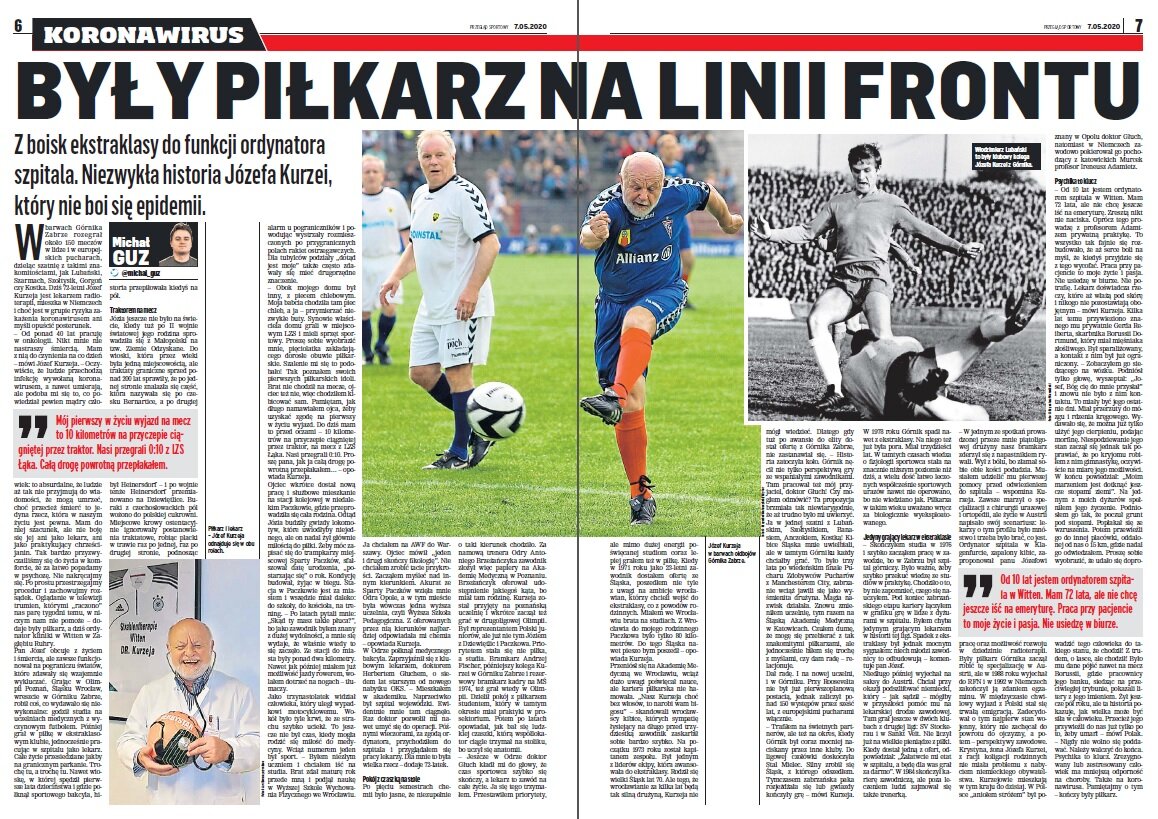„- Od ponad 40 lat pracuję w onkologii. Nikt nie jest w stanie straszyć mnie śmiercią. Mam z nią do czynienia na co dzień - mówi Józef Kurzeja. - Oczywiście, że ludzie chorują od koronawirusa, a nawet umierają, ale podoba mi się to, co powiedział pewien mądry człowiek: to absurdalne, że ludzie aż tak nie przyjmują do wiadomości, że mogą umrzeć. Przecież śmierć to jedyna rzecz, która w naszym życiu jest pewna. Mam do niej szacunek, ale nie boję się jej ani jako lekarz, ani jako praktykujący chrześcijanin. Tak bardzo przyzwyczailiśmy do życia w komforcie, że za łatwo popadamy w psychozę. Nie patrzymy, że w nawet krajach gdzie wirus najbardziej się rozpanoszył, choruje mały ułamek populacji, zwykle dużo mniej niż 1%. Że znacznie ponad 90% spośród tych zakażonych przeżyje. Że u większości zainfekowanych choroba przebiega bezobjawowo. Nie nakręcajmy się. Po prostu przestrzegajmy procedur, słuchajmy lekarzy i zachowujmy rozsądek. Oglądanie trumien w telewizji, którymi „raczono” nas parę tygodni temu, w niczym nam nie pomoże - dodaje były piłkarz, a dziś ordynator kliniki w Witten w Zagłębiu Ruhry”.