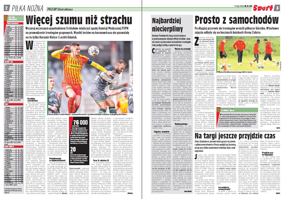 „W poniedziałek w klubach odbywały się testy, a we wtorek trwał ogólnokrajowy szum informacyjny. Jedna osoba z pozytywnym wynikiem tu! Dwie – tam. Kilkanaście – jeszcze gdzieś indziej, no a w Wiśle Kraków czy Cracovii to już w ogóle marnie. Ten zalążek histerii, który część kibiców mogła obrać za bardzo złą monetę w kontekście planu wznowienia ekstraklasy, szybko został jednak zduszony w zarodku. Wczoraj nie wybiła jeszcze godzina 14.00, a zdecydowana większość klubów miała już zgodę Komisji Medycznej PZPN na odbywanie treningów grupowych. Tryb zabarwionego niepewnością oczekiwania pozostawał włączony już tylko w Kielcach i Gdańsku. Choć może nie tylko, a aż...”.