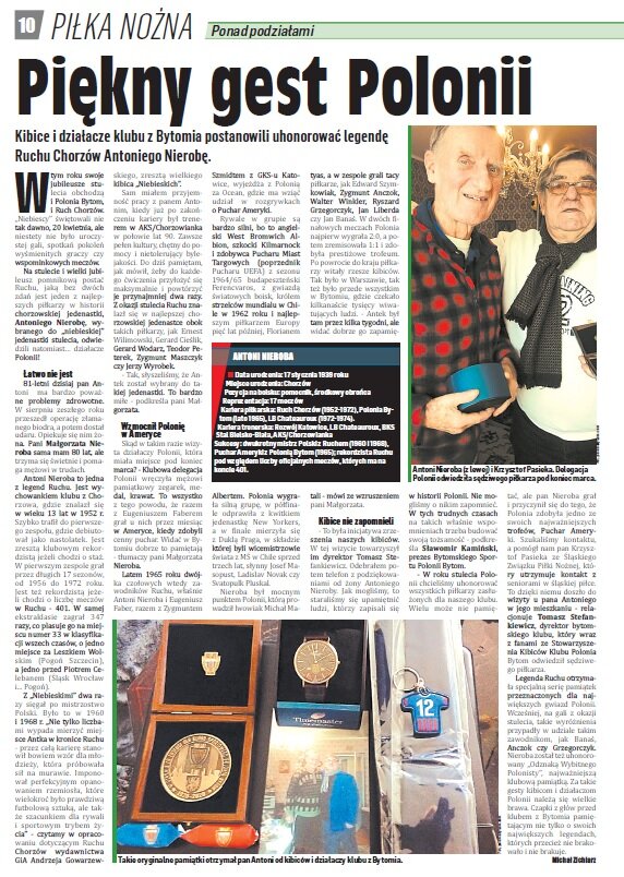„W tym roku swoje jubileusze stulecia obchodzą i Polonia Bytom, i Ruch Chorzów. „Niebiescy” świętowali nie tak dawno, 20 kwietnia, ale niestety nie było uroczystej gali, spotkań pokoleń wyśmienitych graczy czy wspominkowych meczów. Na stulecie i wielki jubileusz pomnikową postać Ruchu, jaką bez dwóch zdań jest jeden z najlepszych piłkarzy w historii chorzowskiej jedenastki, Antoniego Nierobę, wybranego do „niebieskiej” jedenastki stulecia, odwiedzili natomiast… działacze Polonii!”.