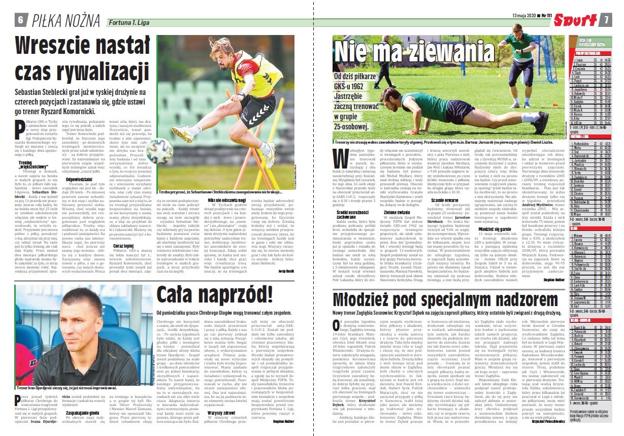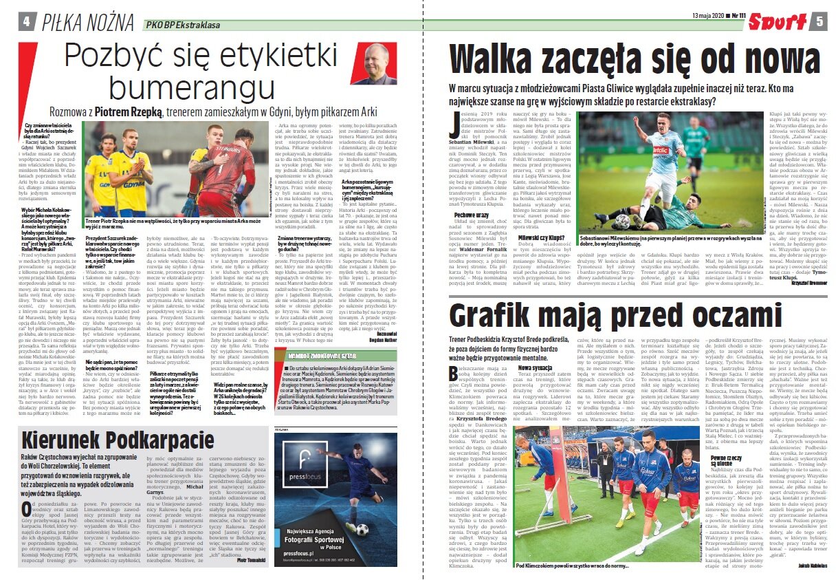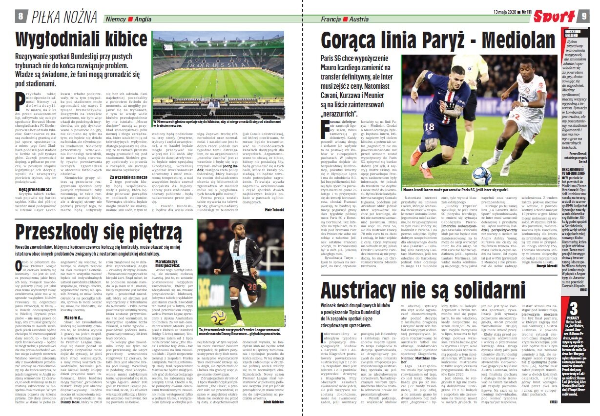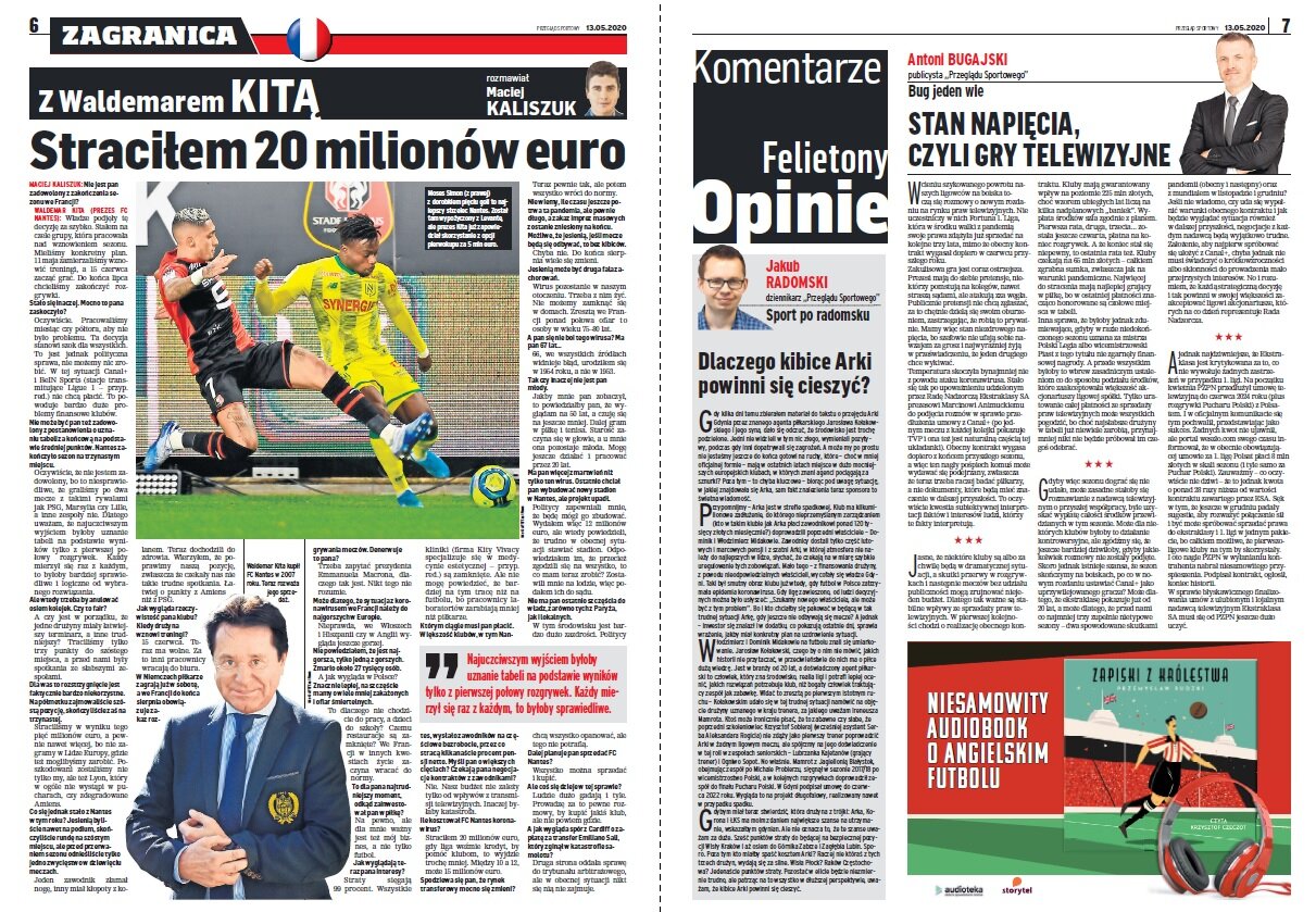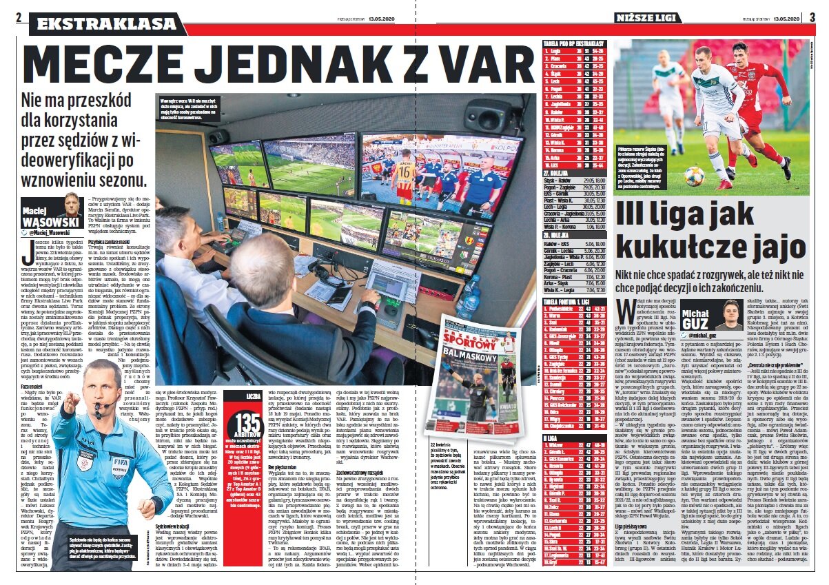 Środowa prasa to kolejne wieści dotyczące warunków powrotów do gry. Dzisiaj przeczytamy o rozwiązaniach dla sędziów – między innymi obecności VAR-u, którego pierwotnie miano nie używać. Warto przeczytać też rozmowę z Arturem Płatkiem (dyrektorem sportowym Górnika), czy Waldemarem Kitą (właścicielem FC Nantes). Dowiecie się też dlaczego kibice Arki powinni się cieszyć z nowych właścicieli i obłudzie Angulo.