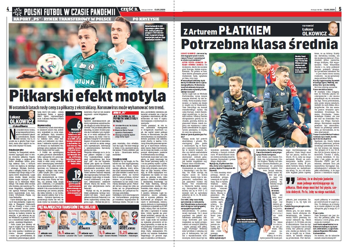 „Skoro jednak istnieje szansa, że sezon skończymy na boiskach, po co w nowym rozdaniu ustawiać Canal+ jako uprzywilejowanego gracza? Może dlatego, że ekstraklasę pokazuje już od 20 lat, a może dlatego, że przed nami co najmniej trzy zupełnie nietypowe sezony – dwa spowodowane skutkami pandemii (obecny i następny) oraz z mundialem w listopadzie i grudniu? Jeśli nie wiadomo, czy uda się wypełnić warunki obecnego kontraktu i jak będzie wyglądać sytuacja również w dalszej przyszłości, negocjacje z każdym nadawcą będą wyjątkowo trudne. Założenie, aby najpierw spróbować się ułożyć z Canal+, chyba jednak nie musi świadczyć o krótkowzroczności albo skłonności do prowadzenia mało przejrzystych interesów.”