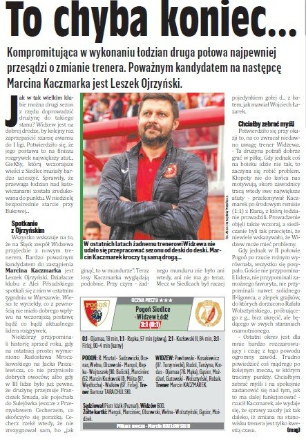 "Wszystko wskazuje na to, że na Śląsk zespół Widzewa przyjedzie z nowym trenerem. Bardzo poważnym kandydatem do zastąpienia Marcina Kaczmarka jest Leszek Ojrzyński. Działacze klubu z Alei Piłsudskiego spotkali się z nim w ostatnim tygodniu w Warszawie. Wieści te wyciekły, co z pewnością nie miało dobrego wpływu na wczorajszą postawę bądź co bądź aktualnego lidera rozgrywek. Niektórzy przypominali historię sprzed roku, gdy na ostatniej prostej wymieniono Radosława Mroczkowskiego na Jacka Paszulewicza, co nie przyniosło dobrych owoców; albo gdy w III lidze było już pewne, że drużynę przejmuje Franciszek Smuda, ale pojechała do Sulejówka jeszcze z Przemysławem Cecherzem, co skończyło się porażką. Cecherz rzekł wtedy, że nie zrezygnował sam, bo „jak ginąć, to w mundurze”. Teraz losy Kaczmarka wyglądają podobnie”.