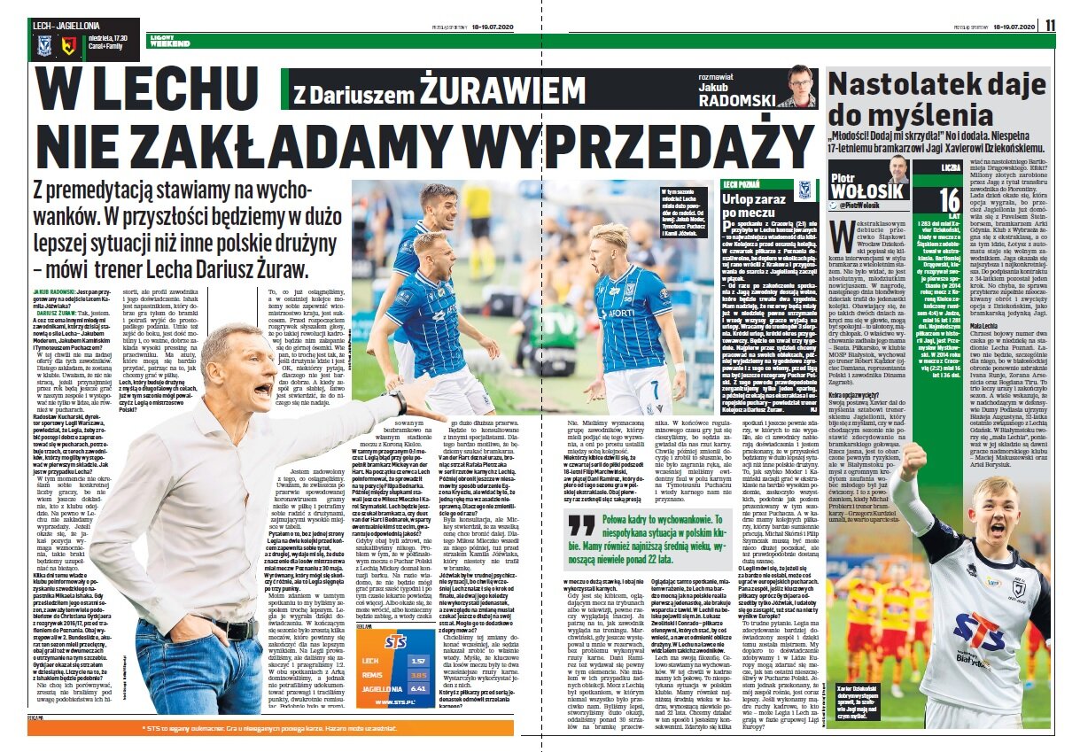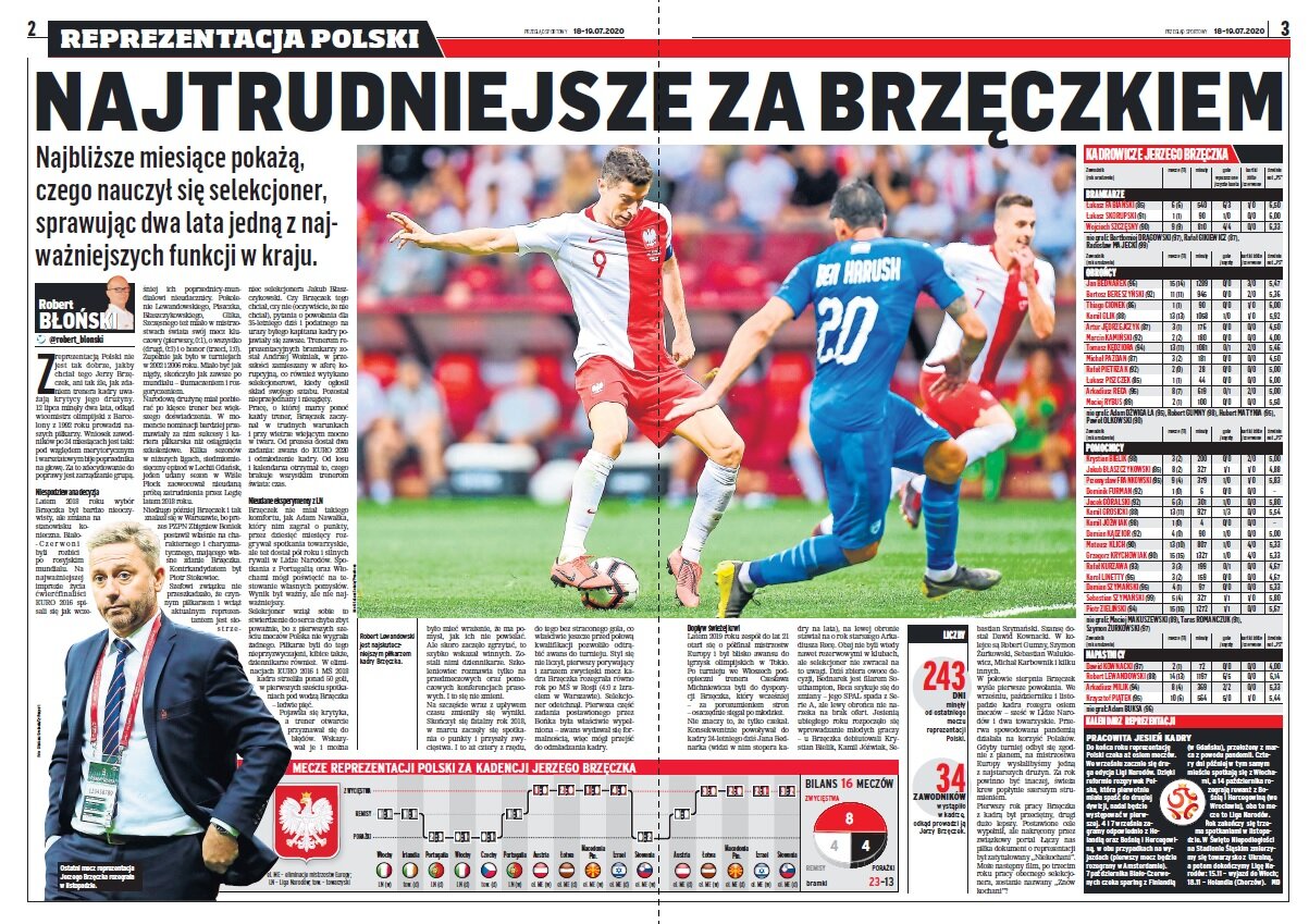 „Jesienią ubiegłego roku rozpoczęło się wprowadzanie młodych graczy – u Brzęczka debiutowali Krystian Bielik, Kamil Jóźwiak, Sebastian Szymański. Szansę dostał Dawid Kownacki. W kolejce są Robert Gumny, Szymon Żurkowski, Sebastian Walukiewicz, Michał Karbownik i kilku innych. W połowie sierpnia Brzęczek wyśle pierwsze powołania. We wrześniu, październiku i listopadzie kadra rozegra osiem meczów – sześć w Lidze Narodów i dwa towarzyskie. Przerwa spowodowana pandemią działała na korzyść Polaków. Gdyby turniej odbył się zgodnie z planem, na mistrzostwa Europy wysłalibyśmy jedną z najstarszych drużyn. Za rok powinno być inaczej, świeża krew popłynie szerszym strumieniem.”