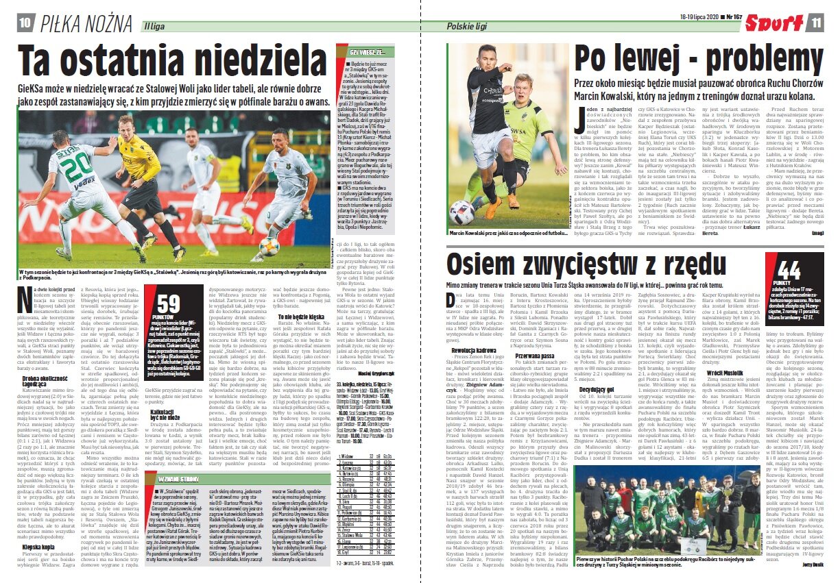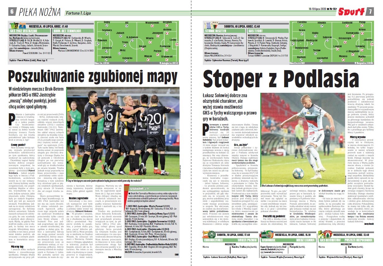 „Opiekun bielskiego zespołu nie ukrywa nawet, że najbliższe mecze będą miały dla niego i zespołu charakter typowo szkoleniowy. Szansę dostaną zawodnicy, którzy w kluczowych spotkaniach grali mniej. To nie tyle rozsądne, co logiczne rozwiązanie. Przypomnijmy, że w przypadku „górali” przerwa w rozgrywkach potrwa cztery tygodnie. Ostatni mecz Podbeskidzie rozegra 25 lipca. Istnieje prawdopodobieństwo, że pierwsze spotkanie w ekstraklasie „górale” zagrają już 21 sierpnia, w piątek, czyli w dzień startu sezonu 2020/21. Skąd taki domysł? Otóż właśnie pierwszego dnia kończącego się sezonu, 19 lipca zeszłego roku, grał ówczesny beniaminek rozgrywek ŁKS. Sezon wcześniej identycznie było w przypadku Miedzi Legnica.”