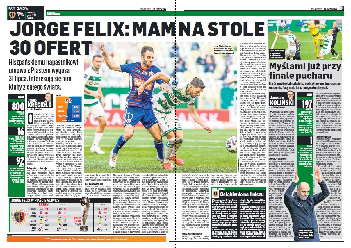 „Nie jest też wykluczone, że po sezonie na biurko dyrektora Wilka trafi konkretna oferta za Piotra Parzyszka lub Jakuba Czerwińskiego. Obaj mają dobry sezon za sobą i jeszcze rok kontraktu. Dla gliwiczan może to być ostatnia okazja na zarobek. Nowi zawodnicy też są spodziewani, bo trener Waldemar Fornalik chciałby utrzymać jakość w drużynie. Spotkanie z Cracovią będzie więc walką o zakończenie sezonu zwycięstwem i korespondencyjną walką z Lechem o srebro.”