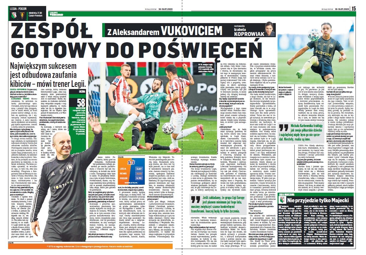 Są kontuzje, o których mówimy, ale i takie, które nie były jawne. Antolić miał naruszone kolano, Cierzniak był po kontuzji pleców, czyli urazie, który w każdej chwili może się odezwać. ZłaNajwiększym sukcesem jest odbudowa zaufania kibiców – mówi trener Legii. mane żebra Pekharta, który grał na blokadzie, Karbownik był poddawany infuzji, ponieważ po meczu pucharowym z Cracovii był tak wyczerpany, że leciała mu krew z nosa. Następnego dnia było to samo. Te przykłady świadczą o tym, że poza Vešoviciem, Novikovasem, Kante, czy Sanogo mieliśmy inne problemy. Ale w sezonie zbudowaliśmy taką ekipę, która jest gotowa do poświęceń.”