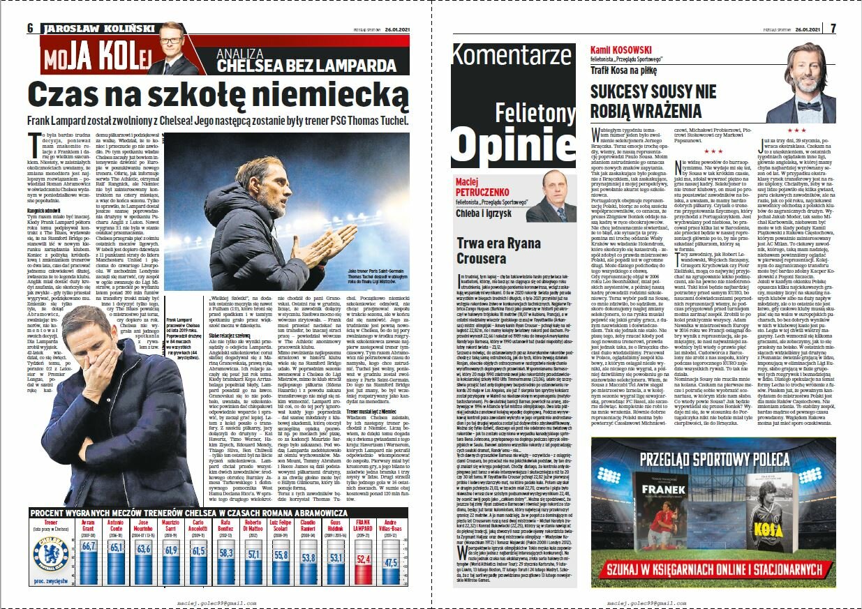 Ale nie tylko złe wyniki przesądziły o odejściu Lamparda. Angielski szkoleniowiec coraz słabiej dogadywał się z Mariną Granovskaią, prawą ręką Abramowicza. Ich relacje zaczęły się psuć już rok temu. Kiedy bramkarz Kepa Arrizabalaga popełniał błędy, Lampard posadził go na ławce. Granovskai się to nie podobało, uważała, że szkoleniowiec powinien dać chłopakowi odpowiednie wsparcie i sprawić, by zaczął grać lepiej.